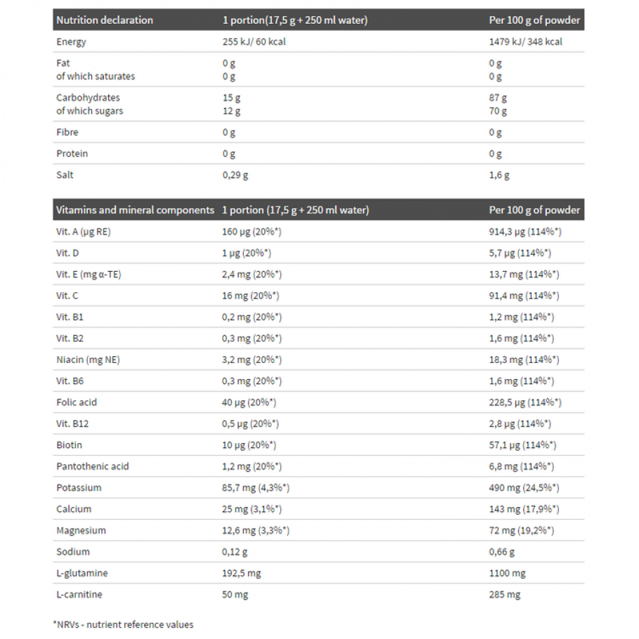 Една порција од пијалакот обезбедува избалансирана доза на витамини, што претставува приближно 20% од препорачаната дневна потрошувачка. Изотоничниот пијалок, како резултат на неговата оптимална сличност со телесните течности, содржината на јагленохидрати и концентрацијата на електролити, многу побрзо и поефикасно го хидрира телото и ја намалува жедта од обичната вода. А со тоа и придонесува за одржување на електролитниот баланс на телото, што е од суштинско значење за правилно функционирање.