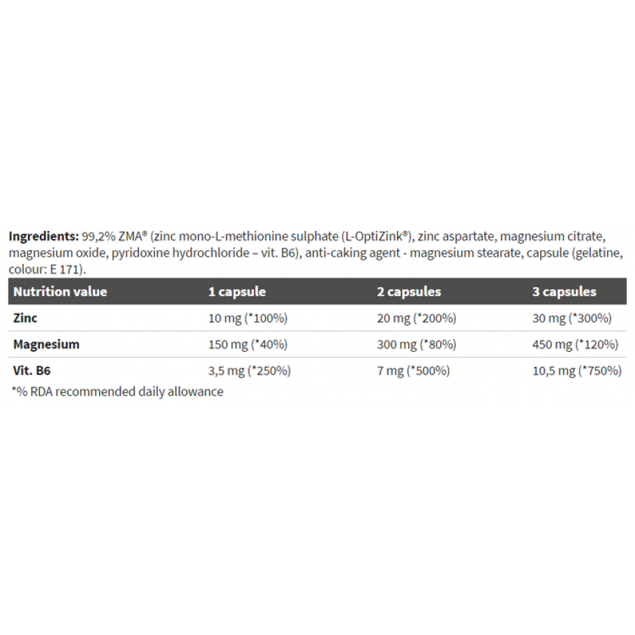 Олимп ZMA е производ кој има уникатен систем на елементите - цинк и магнезиум - хелатни со амино киселини и витамин Б6. Тоа е природен нестеродна анаболна и антиоксидантна формула. Индивидуалните супстанции содржани во производот се од суштинско значење за секојдневна заштита на телото од штетните ефекти од претренираност, во врска со интензивна физичка активност, недостатокот на апетит, трауми, и т.н. оксидативниот стрес. Олимп ZMA придонесува за зголемување на нивото и активност на тестостеронот и го зголемува нивото на ИГФ-I и лептин кои се одговорни за подобро искористување на енергија и за подобрување на издржливоста и силата на телото. Производот го намалува протеинскиот катаболизам, ја поддржува изградбата на мускулната маса, ги спречува грчевите во мускулите, и ја ублажува болката поврзана со претренираност. Тоа ги неутрализира негативните ефекти од прекумерен тренинг, поддржува регенерација на телото и ја спречува појавата на оксидативниот стрес. Покрај тоа, тој ја подобрува концентрацијата и придонесува за длабоко релаксирачки сон. Барањата за елементите и витамин Б6, се зголемува заедно со зголемување на физичката активност. Олимп ZMA се препорачува за спортисти кои практикуваат спортски дисциплини и за физички активните луѓе. Консултации со лекар се наведени во случај на лица со бубрежни заболувања и бремени или доилки.