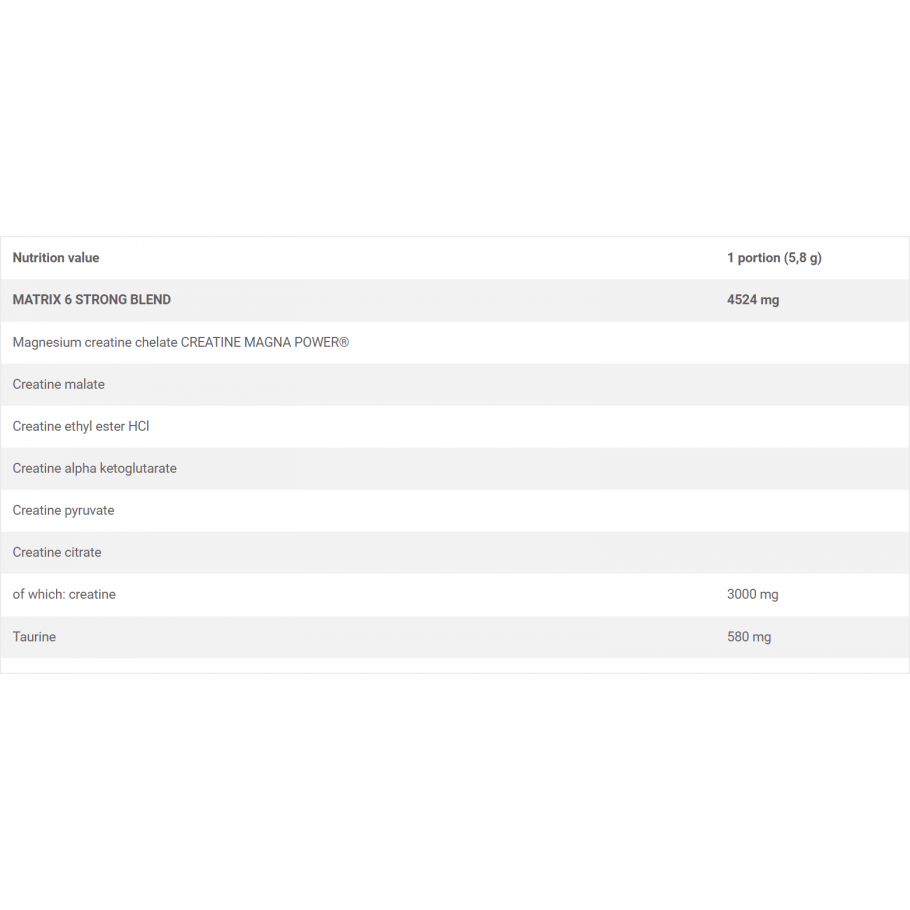 МАТРИЦА 6 СИЛНА МЕШАВИНА (креатин цитрат, креатин малат, креатин етил естер HCl, креатин MagnaPower™ (креатин, магнезиумови соли на лимонска киселина, магнезиумови соли на ортофосфорна киселина), креатин алфа-кетоглутарат, креатин тамосферски регулација, пирувати - натриум цитрати; средство против стврднување - силициум диоксид; засладувачи - ацесулфам К, сукралоза; бои: каротини (A), кармин (B), рибофлавини (C), E 150c (D), E 150d (E), E 133 (F), патентно сино V (G), индиго кармин (H), хлорофили и хлорофилини (I), куркумин (J), антоцијани (К), екстракт од пиперка (L), бетанин (М), растителен јаглерод (N). (A)-(Z) – Во зависност од вкусот на производот за употребените состојки, видете ги симболите (A-Z) покрај датумот на минимална издржливост (најдобро претходно).