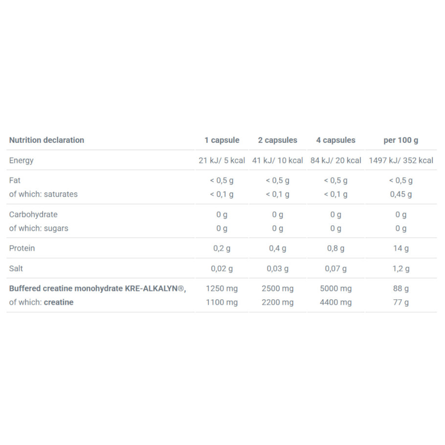 бафериран креатин монохидрат KRE-ALKALYN®, агенс за зголемување – микрокристална целулоза; средство против згрутчување – магнезиумови соли на масни киселини; капсула – желатин.