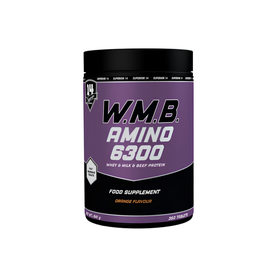 W.M.B. Amino 6300 се таблети за џвакање со амино киселини со освежителен вкус на портокал, кои обезбедуваат целосна поддршка за вашите фитнес цели. Овие амино киселини се внимателно формулирани за да се обезбеди оптимална комбинација од три премиум извори на протеини: изолат од протеин од сурутка, изолат од млечен протеин и хидролизиран концентрат од говедско месо. Затоа името WMB доаѓа од англиските зборови: Whey, Milk и Beef, што значи дека добивате висококвалитетни протеини од три различни извори, обезбедувајќи ги сите есенцијални аминокиселини потребни за побрзо закрепнување на мускулите, зголемена мускулна маса и подобрени спортски перформанси.
